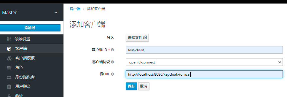 “客户端 ID” 是必填项,填写应用的名称,使用英文字母;“根URL” 填写应用的访问地址。