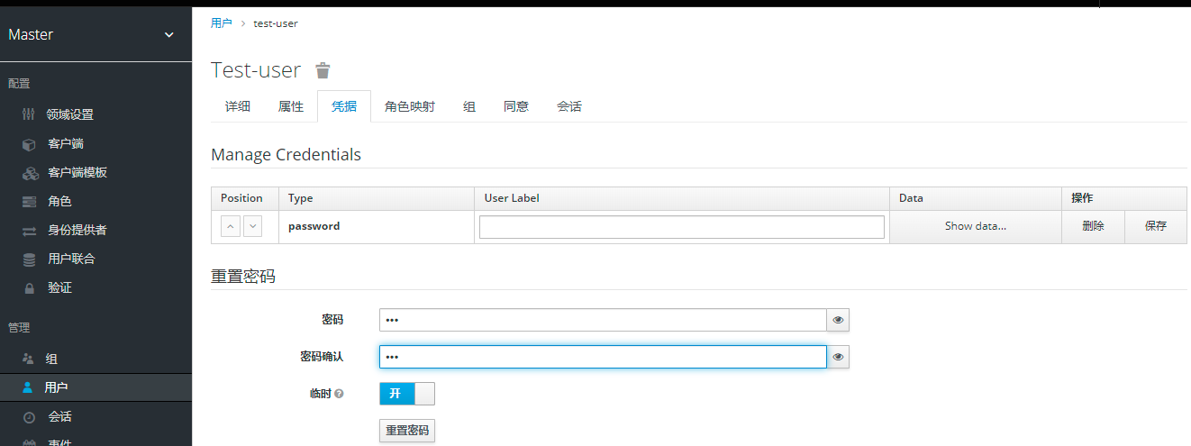 打开用户编辑页面的“凭据”tab 页,可以设置用户的密码。“临时”,点击切换为 关。如果开启,那么该用户在首次登录时会被要求重置密码。