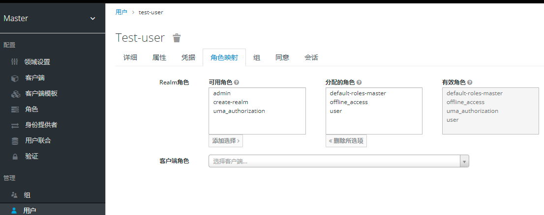 打开用户编辑页面的“角色映射”tab 页,可以将角色分配给用户。
