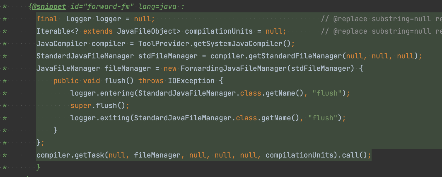 为了简化在API文档中包含示例源代码,在JDK 18中引入了用于JavaDoc的标准Doclet的@Snipket标记。所以,在这个版本中,就可以像下面这样在注释中添加一些示例代码了。