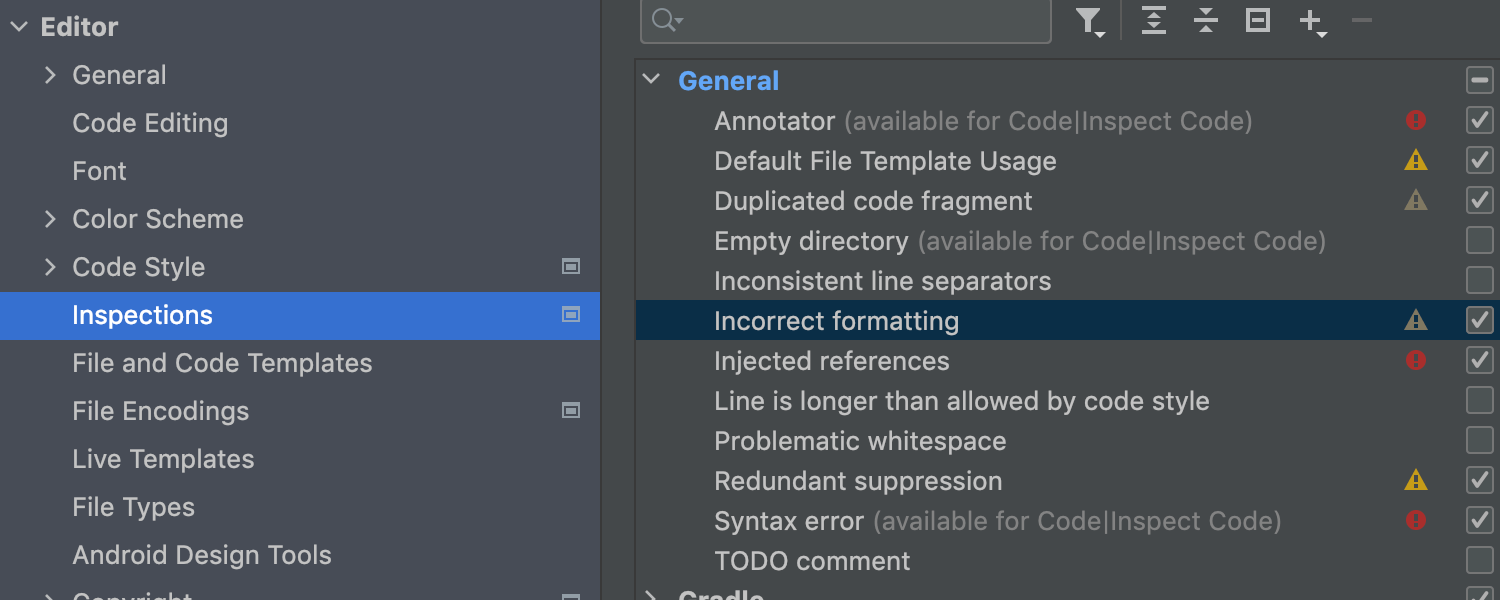 实现了“Incorrect formatting”检测,如果文件的当前格式与代码样式设置不匹配,IDEA将会通知开发者。大家可以通过下面的方式配置开启或关闭。