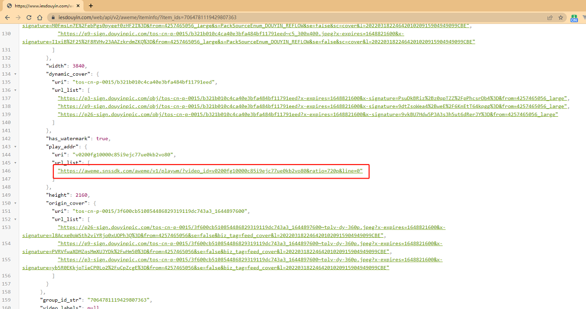 直接用那个链接访问,他其实是一个有水印的链接,仔细观察发现最后那里有一段/playwm,有两个字母wm其实就是watermark英语单词的缩写,去掉wm后就能得到一个无水印链接了
