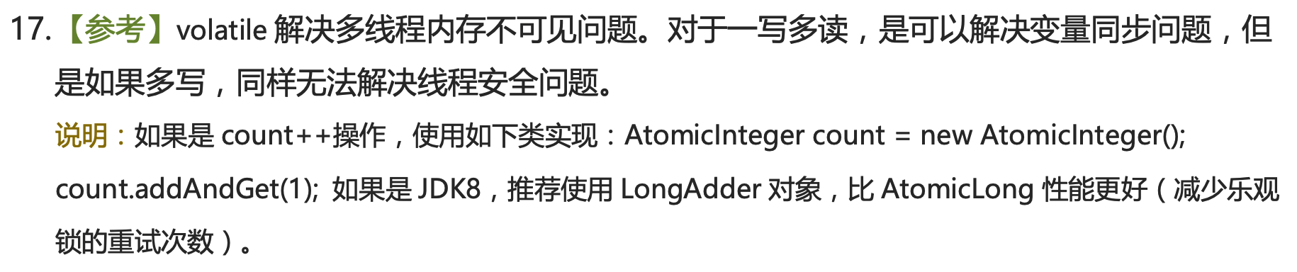 除了 AtomicInteger、AtomicLong,其实在 JDK 8 中更建议使用 LongAdder 进行原子性操作,性能更好,如果你使用的还是 JDK 7-,那当我没说,即使如此,也不能找借口不知道,毕竟 JDK 8 是现在的主流应用版本了。