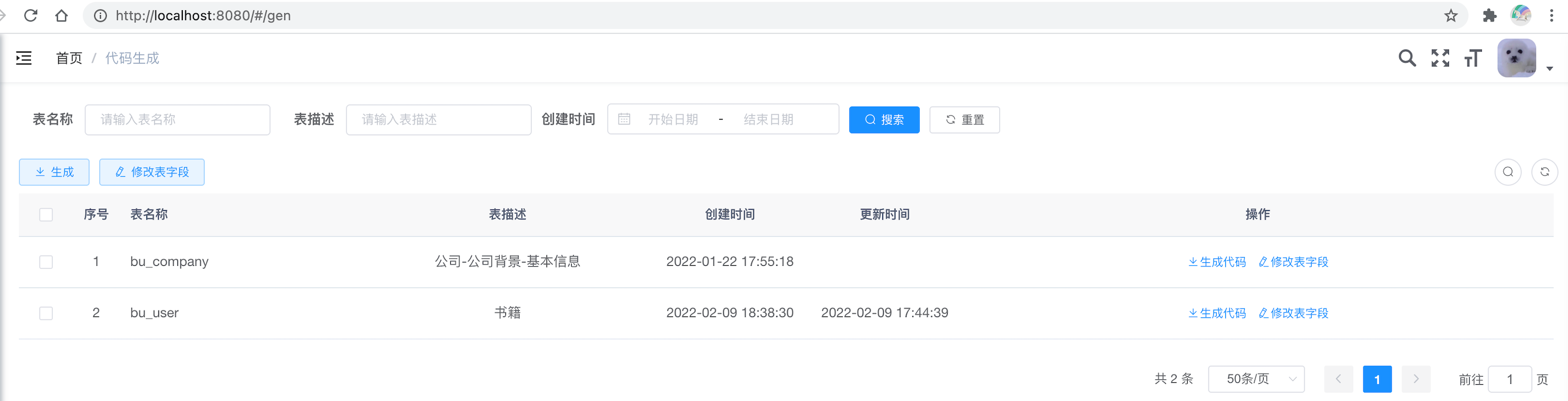 导入系统表后,用户需自定义业务表,方可体验代码生成的功能。