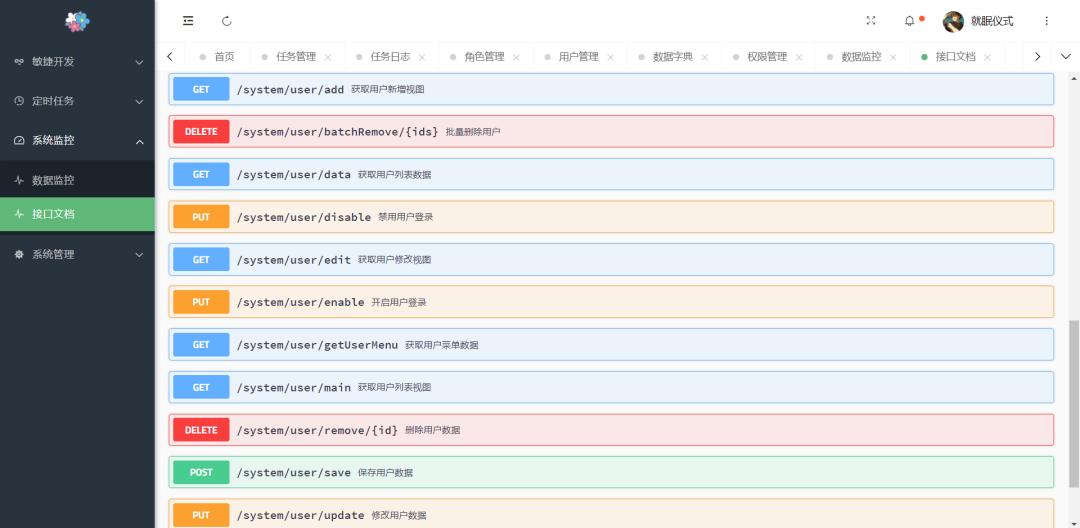 - 系统接口: 根据业务代码自动生成相关的api接口文档。