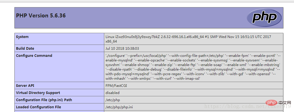 /etc/php ./configure --prefix=/usr/local/php --with-config-file-path=/etc/php --enable-fpm --enable-pcntl --enable-mysqlnd --enable-opcache --enable-sockets --enable-sysvmsg --enable-sysvsem --enable-sysvshm --enable-shmop --enable-zip --enable-ftp --enable-soap --enable-xml --enable-mbstring --disable-rpath --disable-debug --disable-fileinfo --with-mysql=mysqlnd --with-mysqli=mysqlnd --with-pdo-mysql=mysqlnd --with-pcre-regex --with-iconv --with-zlib --with-gd --with-openssl --with-mhash --with-xmlrpc --with-curl --with-imap-ssl Thank you for using PHP. config.status: creating php5.spec config.status: creating main/build-defs.h config.status: creating scripts/phpize config.status: creating scripts/man1/phpize.1 config.status: creating scripts/php-config config.status: creating scripts/man1/php-config.1 config.status: creating sapi/cli/php.1 config.status: creating sapi/fpm/php-fpm.conf config.status: creating sapi/fpm/init.d.php-fpm config.status: creating sapi/fpm/php-fpm.service config.status: creating sapi/fpm/php-fpm.8 config.status: creating sapi/fpm/status.html config.status: creating sapi/cgi/php-cgi.1 config.status: creating ext/phar/phar.1 config.status: creating ext/phar/phar.phar.1 config.status: creating main/php_config.h config.status: executing default commands [root@localhost php-5.6.36]# make [root@localhost php-5.6.36]# make install