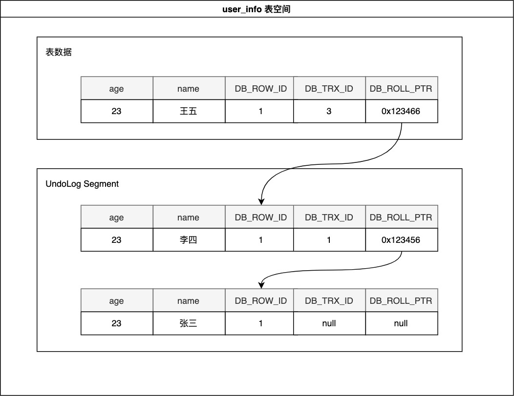 age=23的用户,把name修改为李四;此时由于事务A尚未提交,所以会给事务A生成一条UndoLog,UndoLog中存储了事务A修改前的数据,表空间中最新数据中的回滚指针指向这条日志;