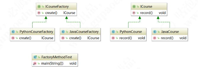 工厂方法模式主要解决产品扩展的问题,在简单工厂中,随着产品链的丰富,如果每个课程的创建逻辑都有区别,则工厂的职责会变得越来越多,有点像万能工厂,并不便于维护。根据单一职责原则,我们将职能继续拆分,专人干专事。Java课程由Java工厂创建,Python课程由Python工厂创建,对工厂本身也做抽象。首先创建ICourseFactory接口。