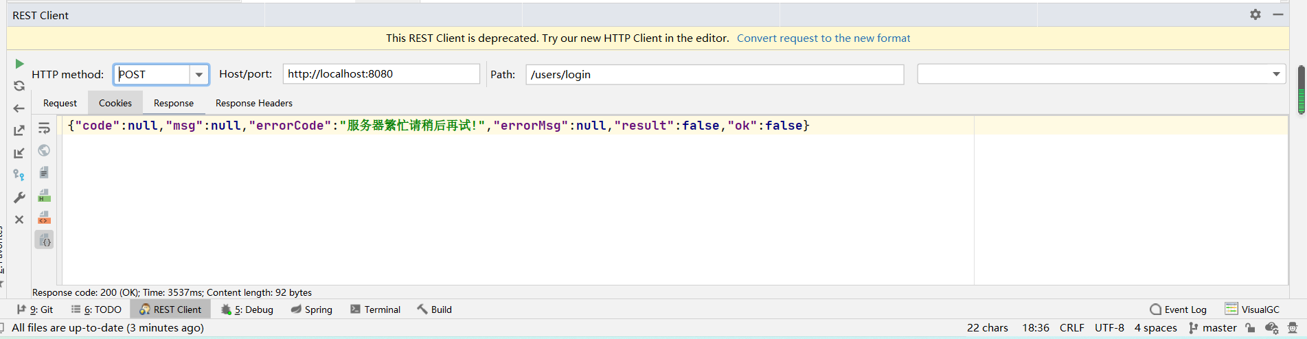 请求用户登录接口,此时所有操作全部成功,用户服务修改LAST_LOGIN_DATE成功,并且t_member_integral表中数据新增成功;这里就不贴图了,浪费大家流量。