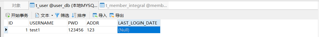 请求成功后查看t_user与t_member_integral依旧没有发生任何改变: