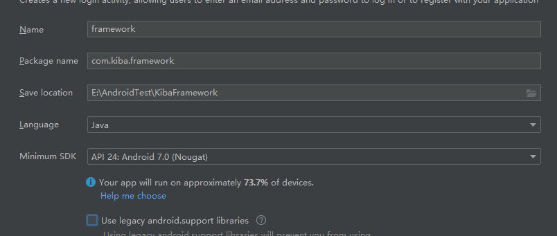首先新建项目KibaFramework,不要勾选use legacy android.support libraries。