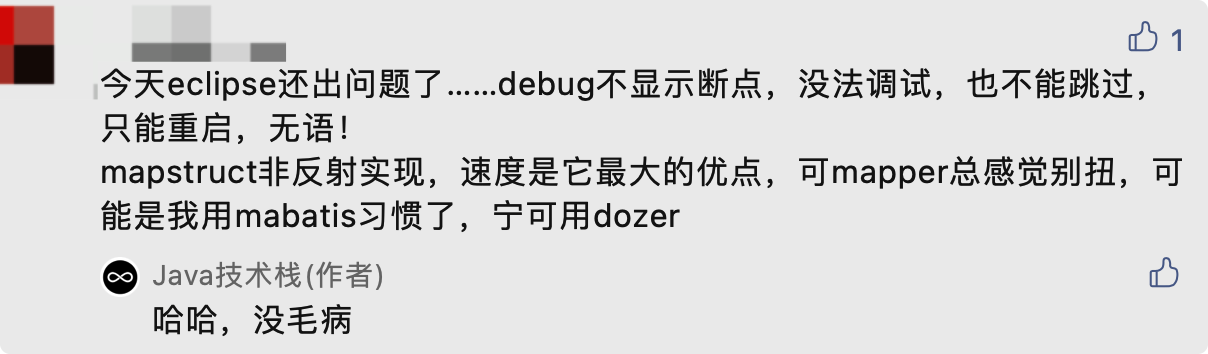 旨在优雅的代替满屏的 get/set 以及 BeanUtils 工具类,然后栈长也收到了一些留言,其中很多朋友就是推荐使用 Dozer 的: