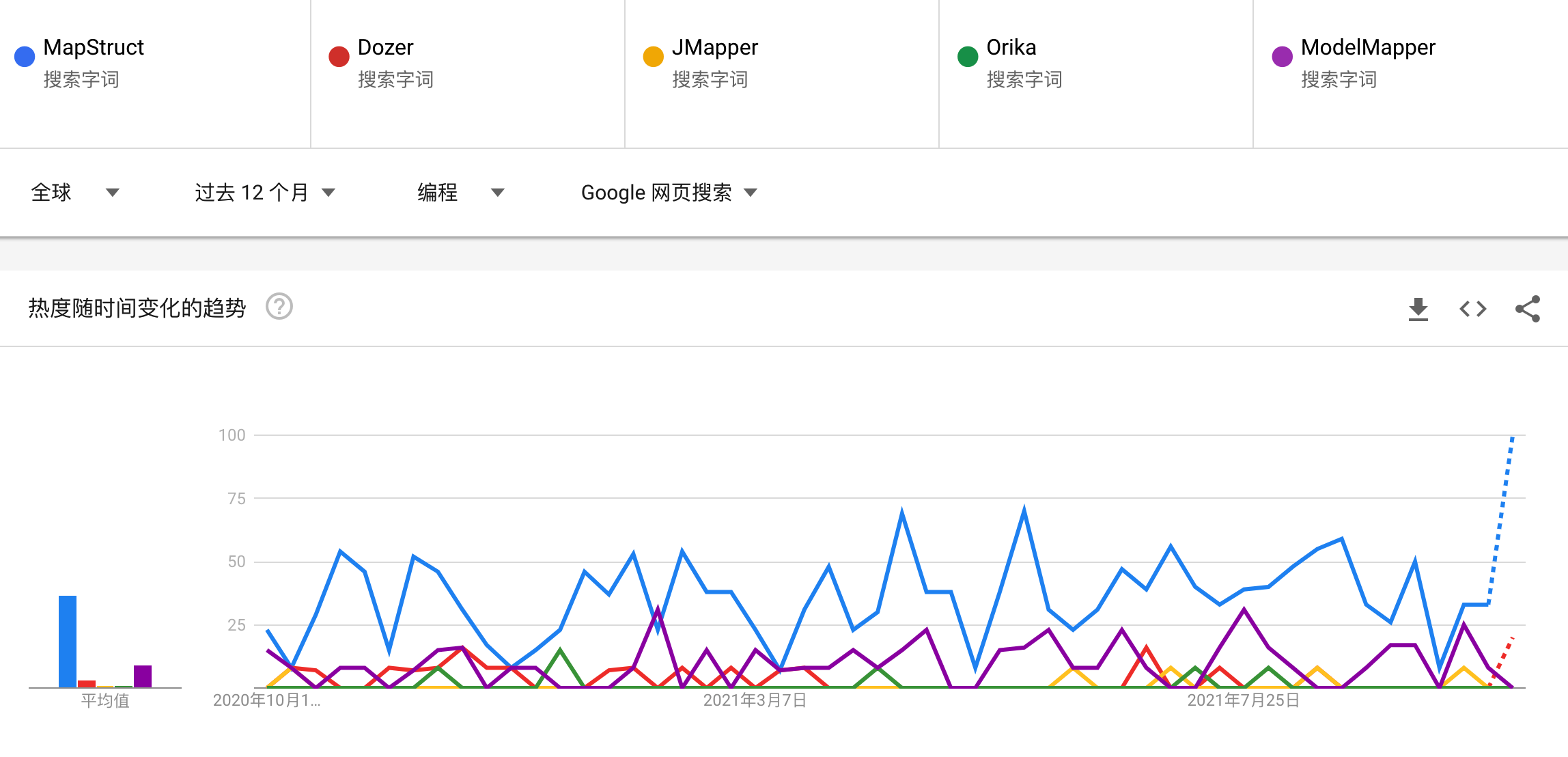 上图调整到了中国,数据很少,显然中国地区使用 Google 搜索的相对不多,但也能看到 MapStruct 确实是使用最多的,另外就是 Dozer、ModelMapper 了。