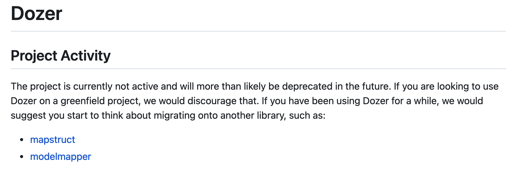 Dozer 项目当前不再维护了,并且将来很大可能被弃用,然后新用户不建议使用了,老用户也推荐大家迁移到 MapStruct 和 ModelMapper 等类库上面去。