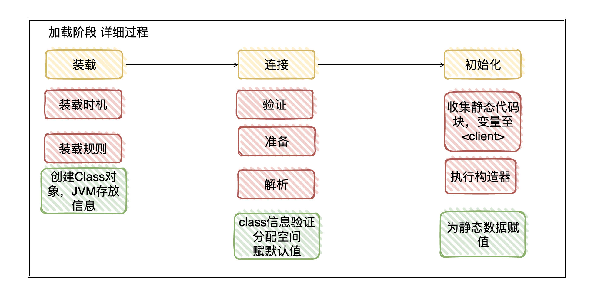 - 「加载」又可以细分步骤为:装载->连接->初始化。装载则把class文件装载至JVM,连接则校验class信息、分配内存空间及赋默认值,初始化则为变量赋值为正确的初始值。连接里又可以细化为:验证、准备、解析