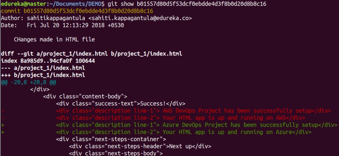 该命令经显示指定提交的元数据以及内容变更。