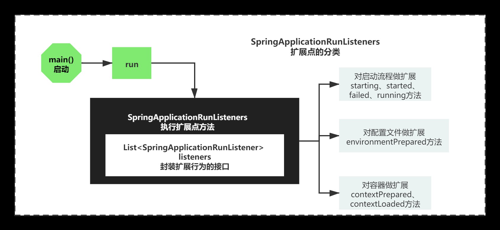 思考点:扩展点SpringApplicationRunListeners,扩展点的核心思路,是封装一个Listener接口实现列表到一个类中,这个类通过不同的方法遍历这个接口实现列表,从而实现不同阶段的扩展。