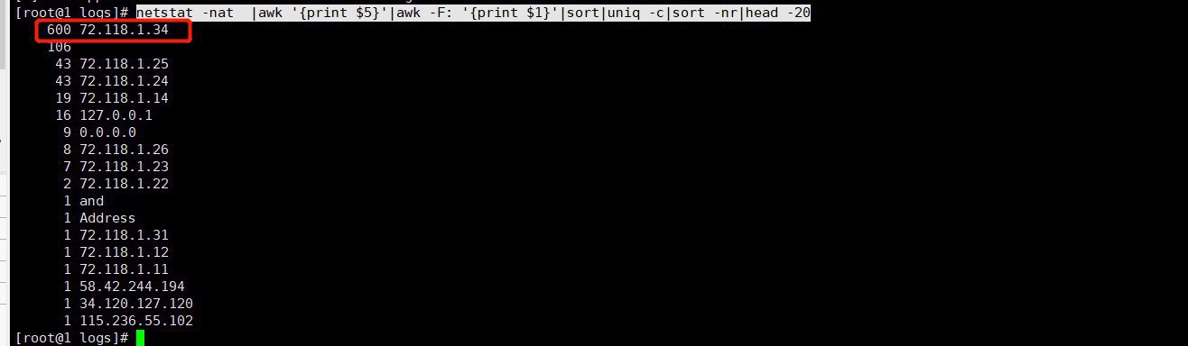 5.我们去服务器端服务器执行 netstat -nat |awk “{print $5}”|awk -F: “{print $1}”|sort|uniq -c|sort -nr|head -20 查询根据ip排序查询当前的连接数,此时发现redis这个ip的连接有600条