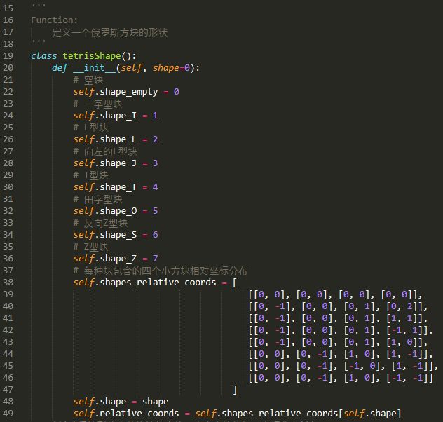 首先,我们来定义一个俄罗斯方块类,其具体作用为利用小方块组成不同形状的板块: