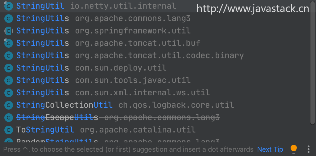 首先,这两个方法用的都是工具类 StringUtils 里面的方法,都是用来判断字符串是否为空的,而这个工具类到处都是,如下图所示,栈长输入 StringUtil,很多类似的工具类就蹦出来了: