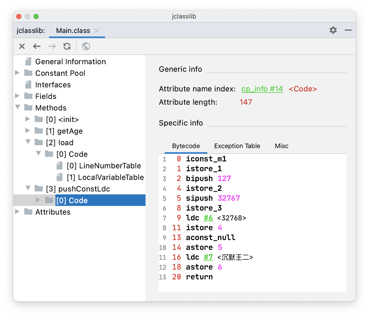 通过 jclasslib 看一下 pushConstLdc() 方法的字节码指令。
