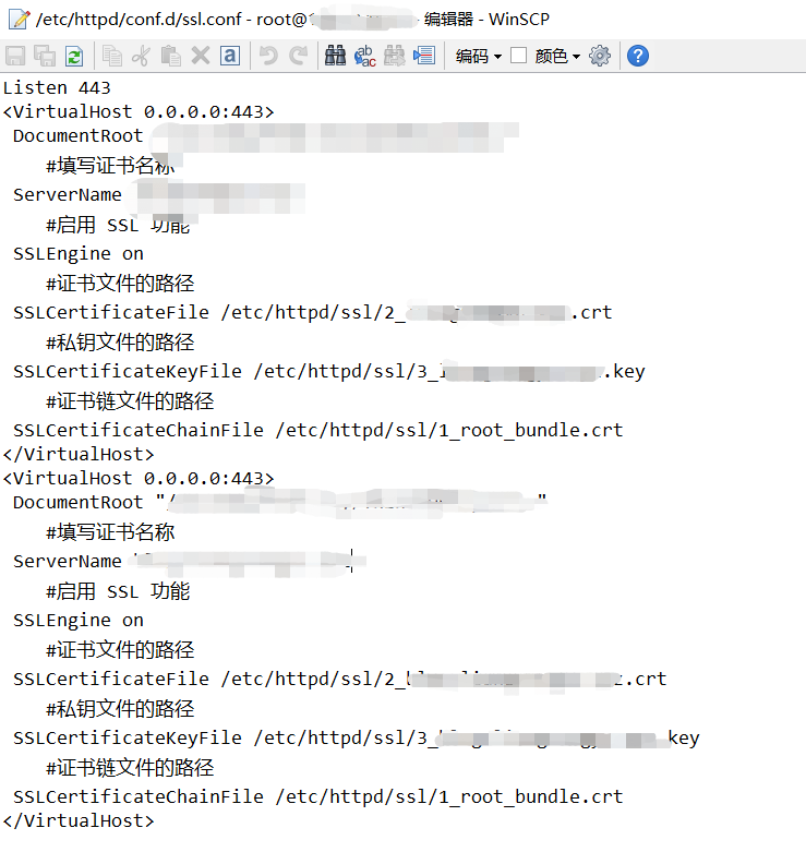 编辑 /etc/httpd/conf.d 目录下的 ssl.conf 配置文件。修改如下内容: