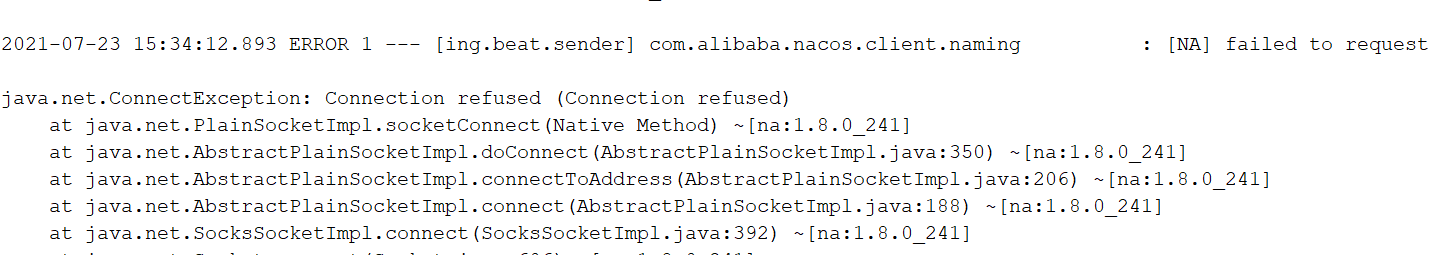 我看了日志信息之后,刚开始还是没有在意的。毕竟是nacos报错,报错还那么明显:java.net.ConnectException: Connection refused (Connection refused)