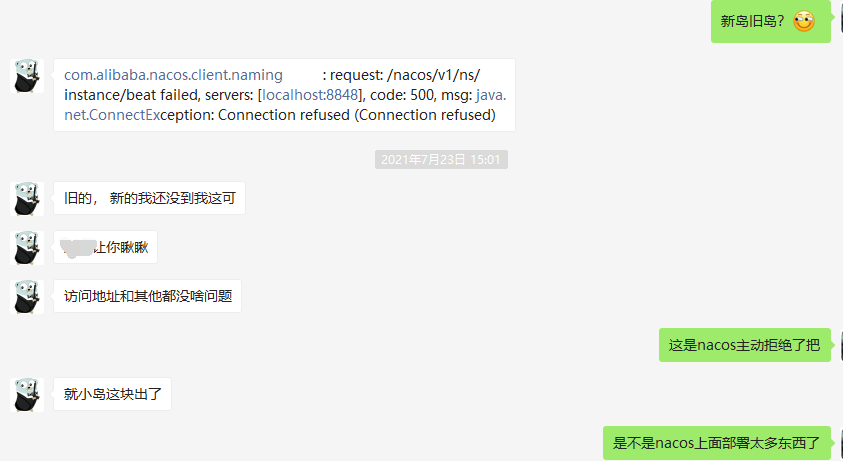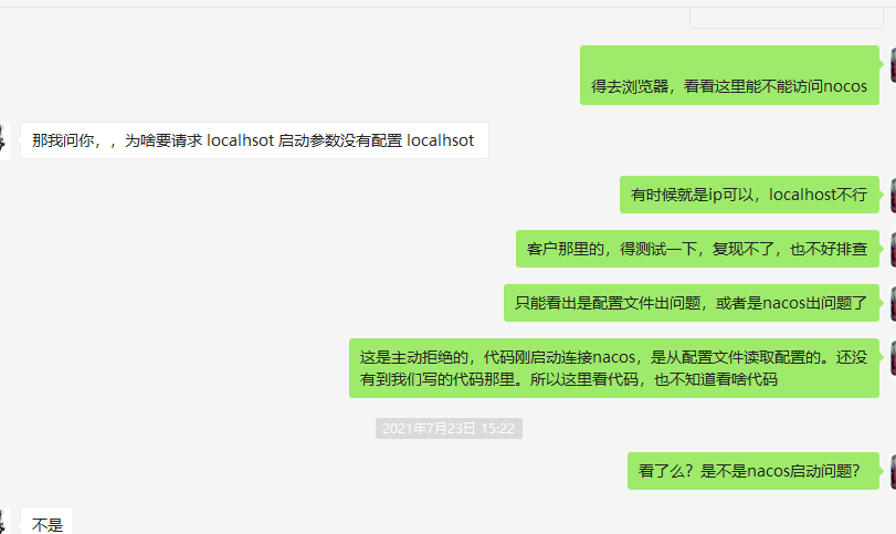 我信心满满告诉他,是nacos没起起来,或者是配置文件有问题。这不是代码的问题。(这里带有一点点侥幸心理)