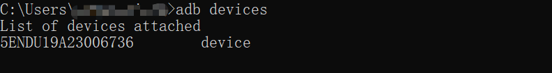 首先需要一台开启了开发者权限的安卓手机,部分手机的开启步骤为:设置–关于手机–连续点击版本号数次,开启成功后可以在设置里找到类似“开发人员选项”的设置项,然后再打开“USB调试”功能,即可以通过 USB 连接对手机进行调试,最后将手机连接到电脑上,在 CMD 窗口中输入“adb devices”查看当前连接的设备,如下图所示即为连接成功: