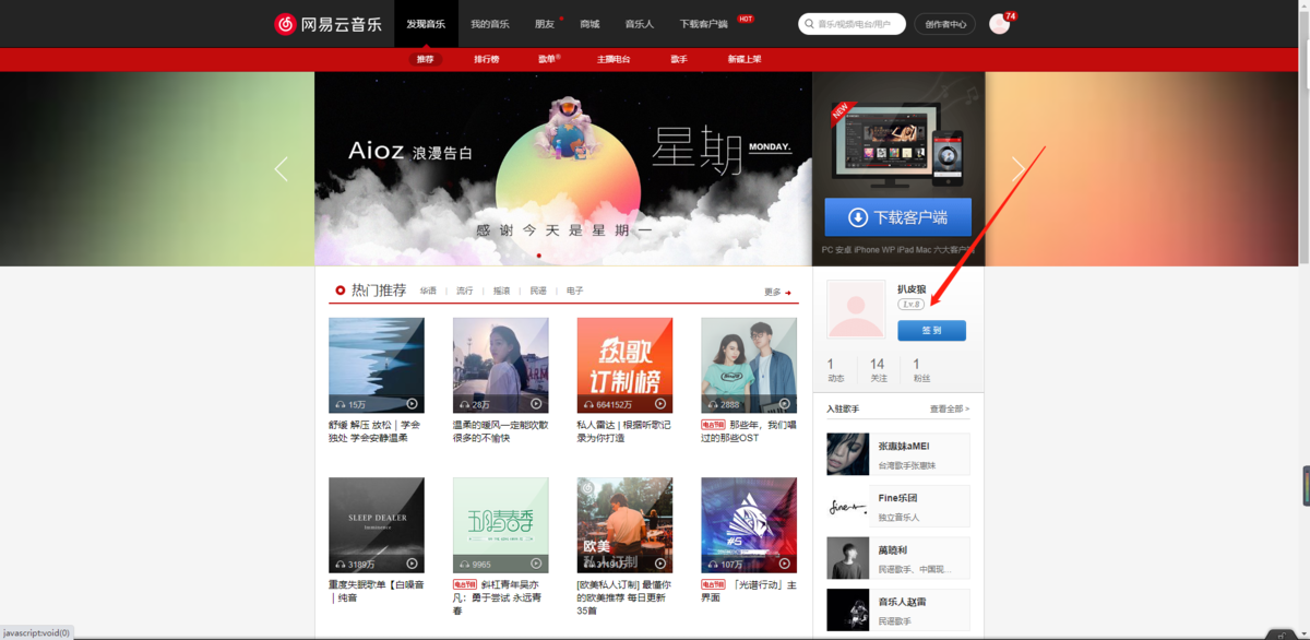 成功登录之后,我们来分析一下如何实现网易云音乐的自动签到。按F12打开开发者工具或鼠标右键检测,然后点击一下网易云音乐的签到按钮: