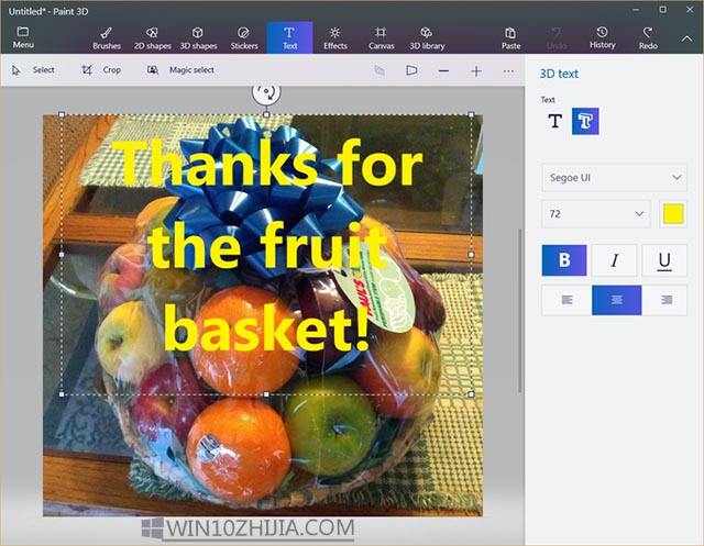 使用Paint 3D,用户可以应用滤镜来更改图像的氛围,添加2D和3D对象,以及使用特殊效果增强图像。 在我们的示例中,我们插入了一个文本叠加层,如图C所示。