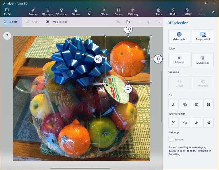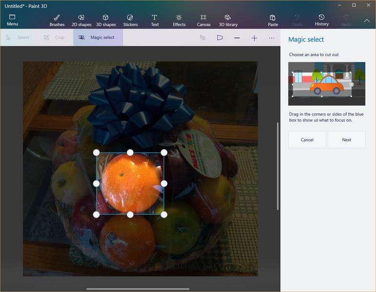 Paint 3D的一个更强大的功能是Magic选择功能。 它的工作方式类似于裁剪功能,因为您选择图像的一个区域,如图D所示。但是,魔术选择功能将处理突出显示的区域,以尝试隔离并从图像中选择特定对象。