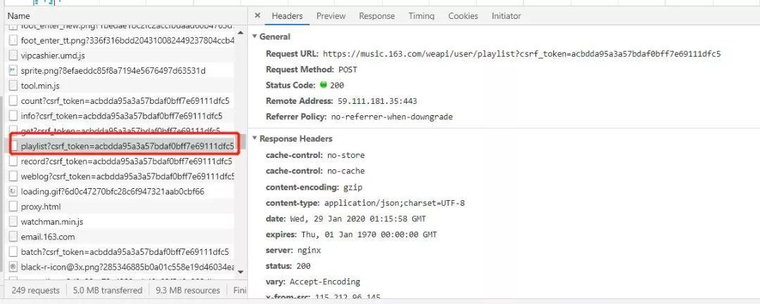 其中csrf_token的值在用户登录后的session的cookies中可以找到,由此我们可以获得我们需要的歌单相关的信息,代码实现如下:
