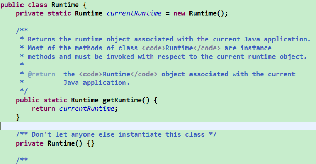 由于单例模式只生成一个实例,减少了系统性能开销,当一个对象的产生需要比较多的资源时,e.g.读取配置、产生其他依赖对象,则可以通过在应用启动时直接产生一个单例对象,然后永久驻留内存的方式来解决。(e.g.java.lang.Runtime)