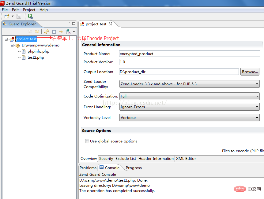php文件加密的方法:1、打开Zend Guard 5.5.0;2、选择要进行加密的源文件或文件夹;3、选择PHP的版本;4、右键单击“Encode Project”;5、在产品的输出目录里查看加密后的文件。