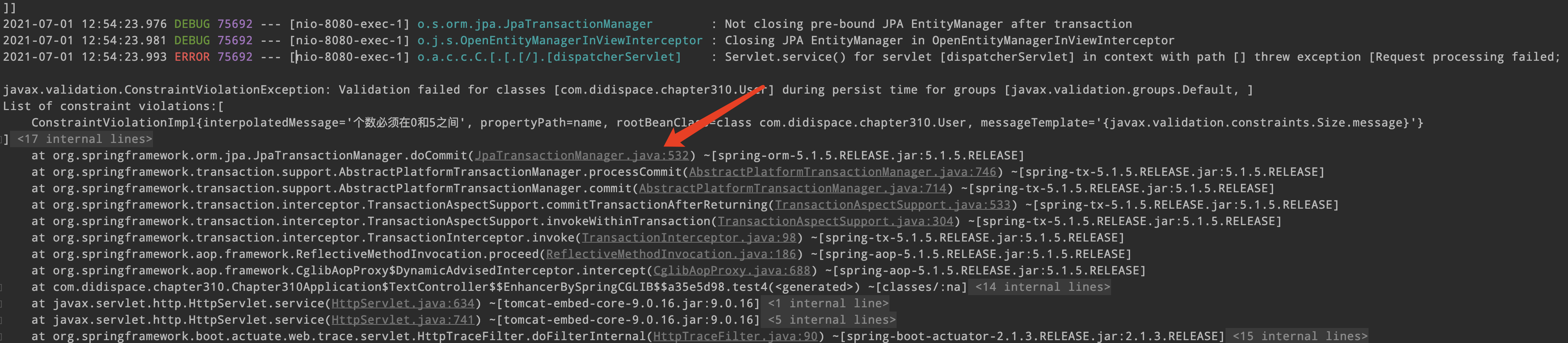 这个异常是这个回滚的关键。这个异常javax.validation.ConstraintViolationException是哪里的呢?还记得以前说的JSR 303不?对的,是Bean Validation中的异常。