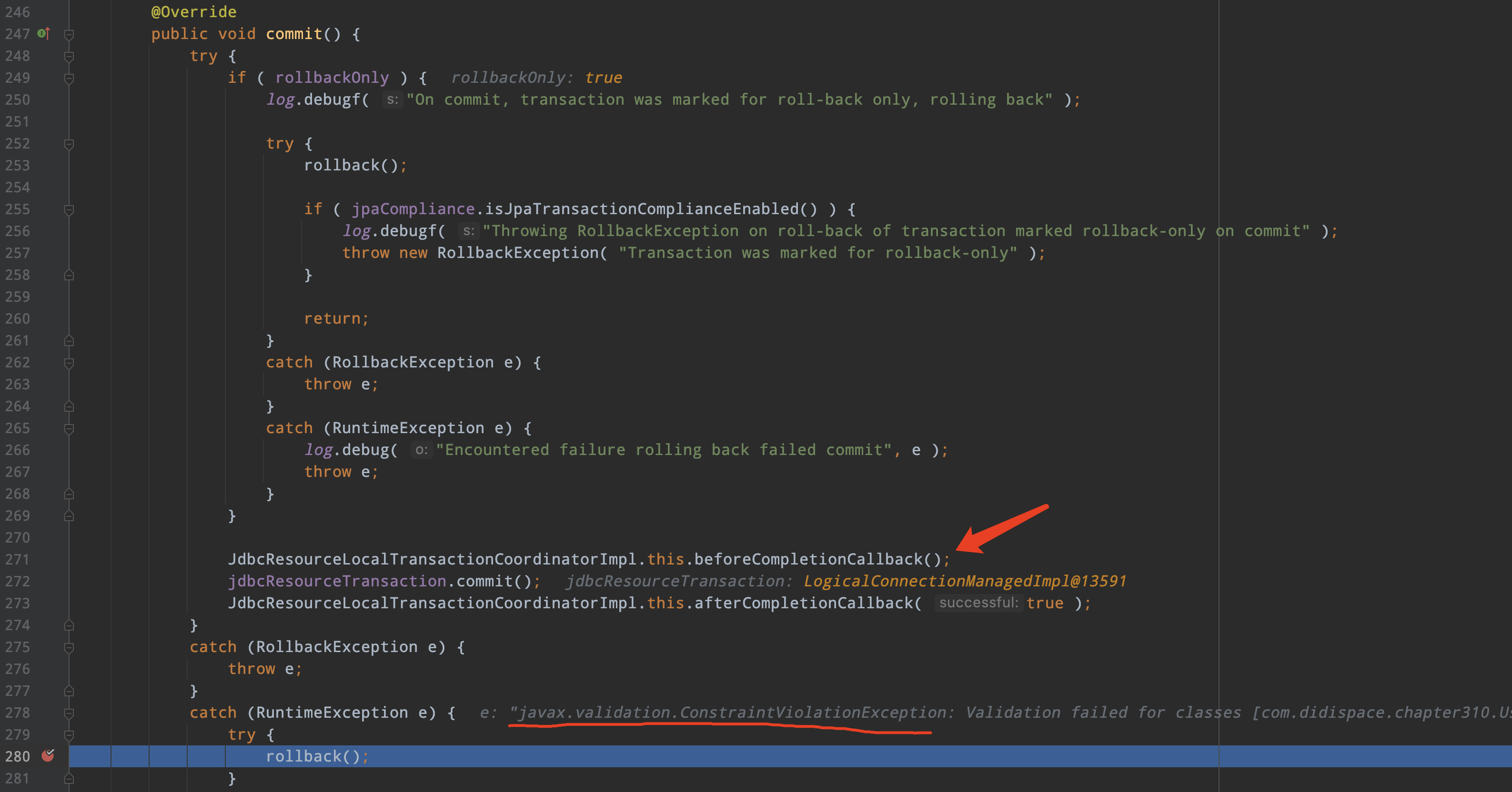 可以看到校验异常是从271行出来的,结合278行和280行,是不是清楚这里回滚的原因了呢?