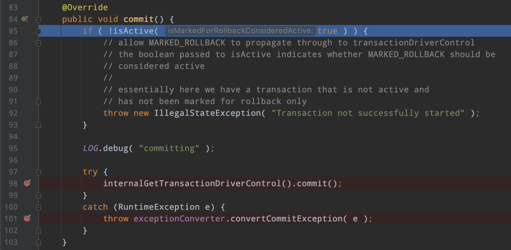 错误行数在532行tx.commit(),习惯性的加上断点,这样下一次进来的时候可以看看当前情况下的各种参数情况。