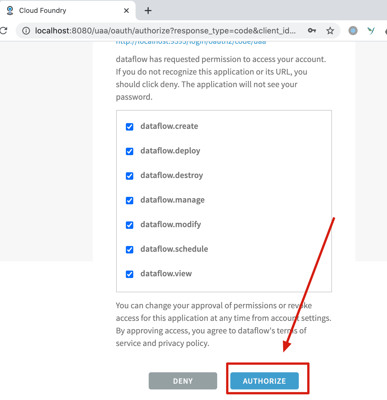 --scope cloud_controller.read,cloud_controller.write,openid,password.write,scim.userids,sample.create,sample.view,dataflow.create,dataflow.deploy,dataflow.destroy,dataflow.manage,dataflow.modify,dataflow.schedule,dataflow.view