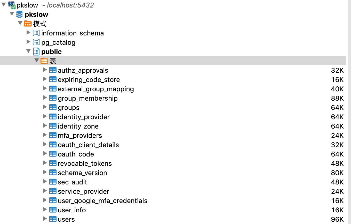 配置完成启动UAA,就可以看到PostgreSQL已经自动生成了许多相关的表了。
