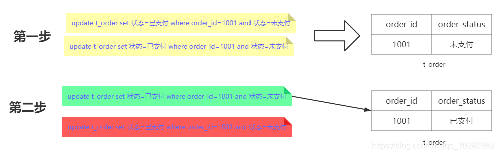 如下图,两个sql一起执行修改订单状态,但是肯定只会有一个sql修改成功。