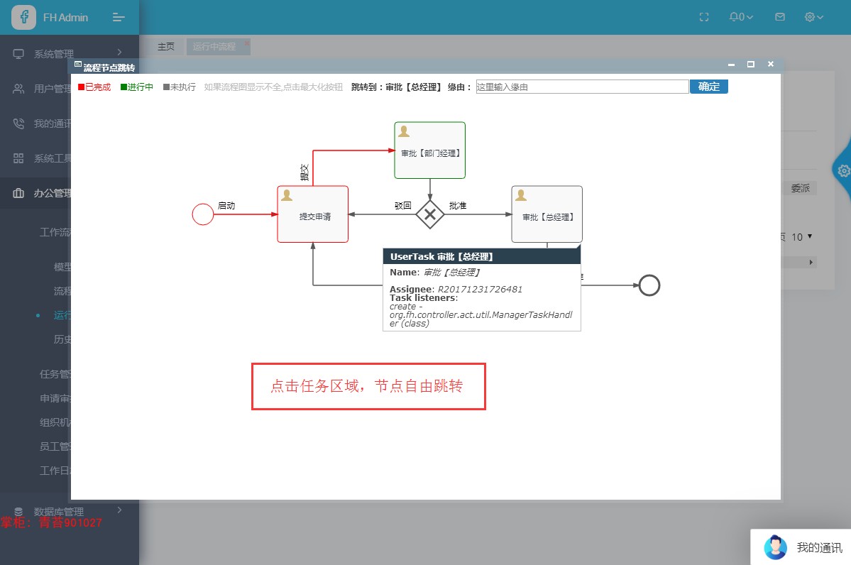 3.运行中流程:查看流程信息、当前任务节点、当前流程图、作废暂停流程、指派待办人、自由跳转
