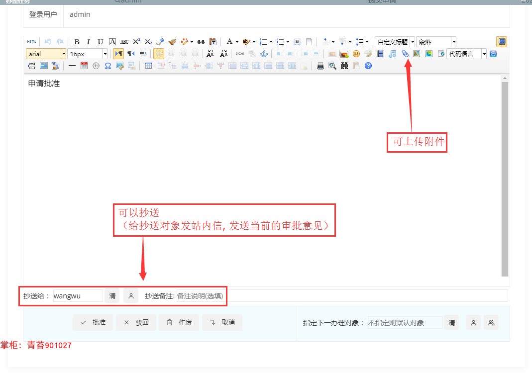办理任务时候可以选择用户进行抄送,就是给被抄送人发送站内信通知当前审批意见以及备注信息
