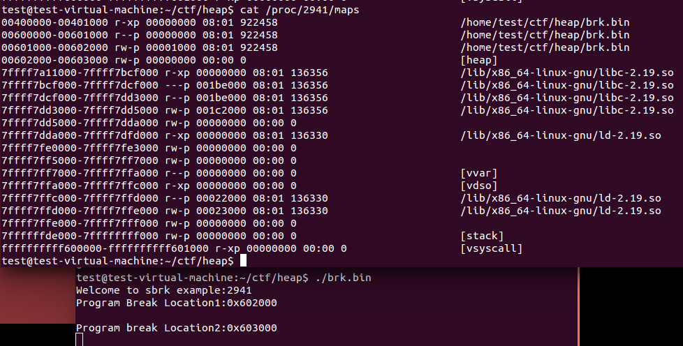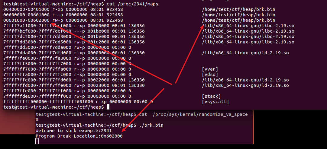 上面的进程虚拟内存布局展示了,start_brk是堆段的开始位置 ,brk(program break)是堆栈的结束位置。