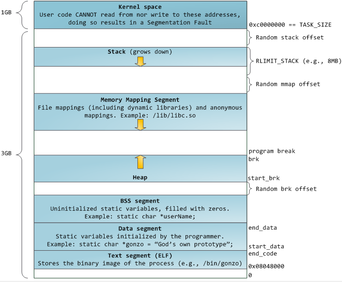 - 当ASLR(Address Space Layout Randomization)关闭时,start_brk和brk同时指向data/bss段的结束位置(end_data)