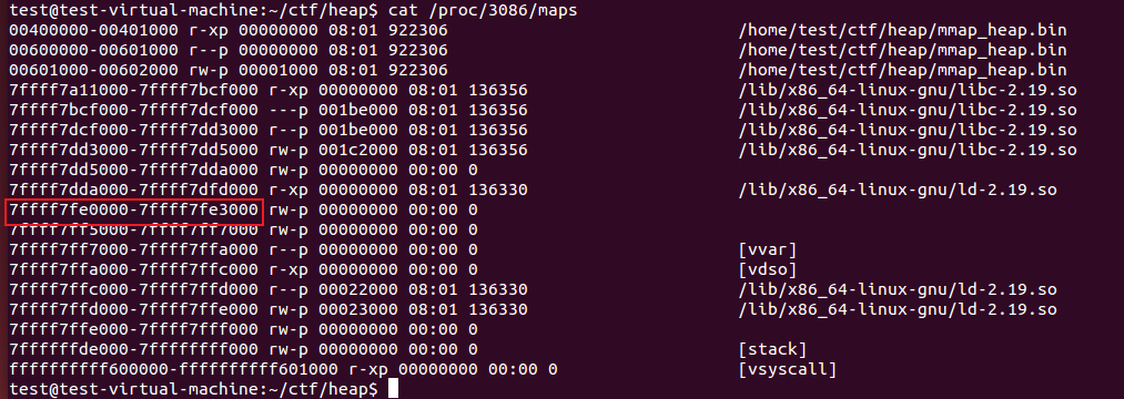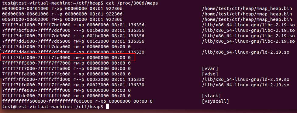 调用mmap之后:如下我们可以看到,mmap映射的内存段已经从上图红色框内分配出去(0xe0000-0xbf000=0x21000).