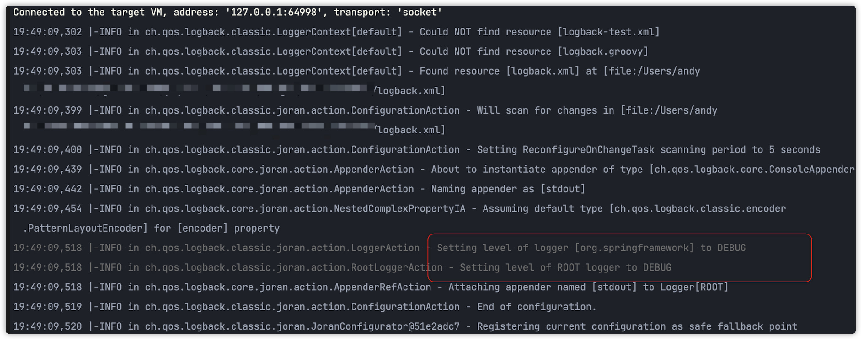 从这个日志可以看到,Logback Root 已经设置为 DEBUG。