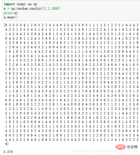 import numpy as np a = np.random.randint(1,7,1000)print(a)a.mean()