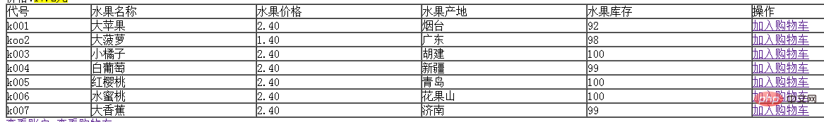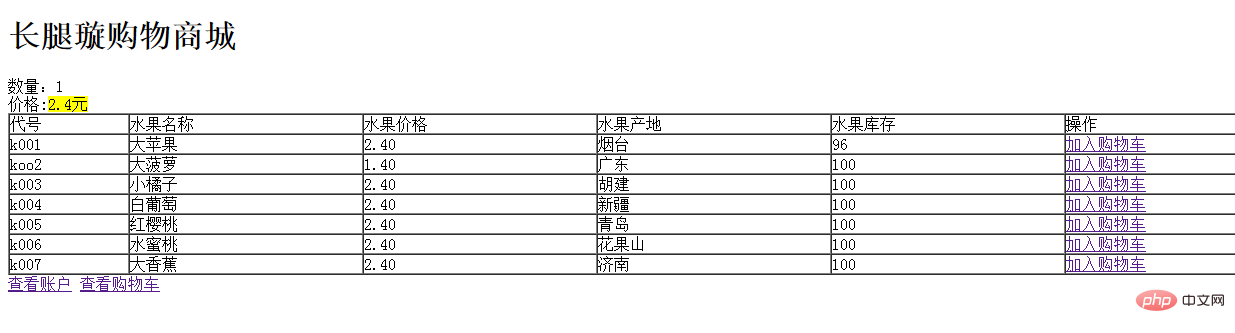 </table> <a href="tijiao.php">查看账户</a> <a href="ckgwc.php">查看购物车</a> </body>
