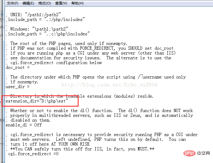 第一步:然后用记事本打开Windows文件夹下的“php.ini”文件,将“extension_dir =”./””该成“extension_dir ="D:phpext"”(自己的路径),最后保存即可,如下图: